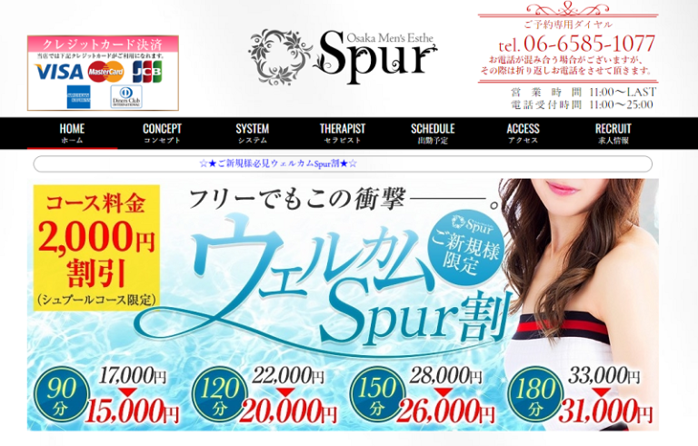 西日本を代表する繁華街、大阪のミナミにて人々の注目を集めるメンズエステ「Spur(シュプール)」。容姿端麗な女性が集まるエリアの中でも、特に輝く存在を集めています。見た目のみに頼るセラピストは皆無、確かなテクニックでお客様のこわばった体を丁寧にケアしてくれます。指圧にストレッチを組み合わせた施術はスッキリと疲れを軽減、血行も改善して老廃物もグググとデトックス。また清潔で居心地の良い空間づくりにもこだわっています。料金は90分で13,000円、上位コースの「シュプールコース」は4,000円アップ、お客様の要望する体の部位の疲れを取り除くためにスペシャルなトリートメントを施します。クレジットカード決済対応、難波駅より徒歩5分程度でアクセスできます。